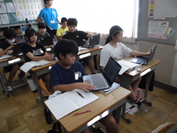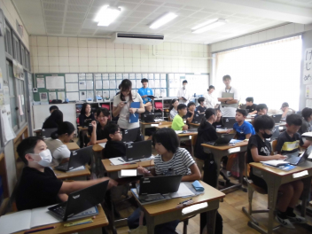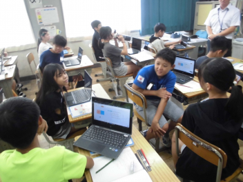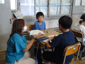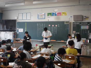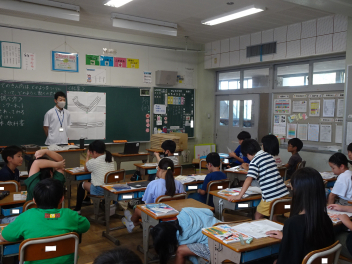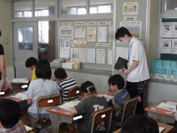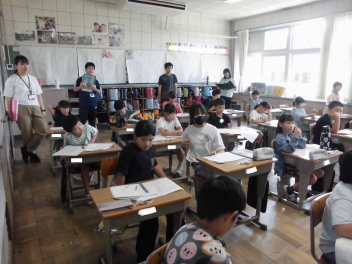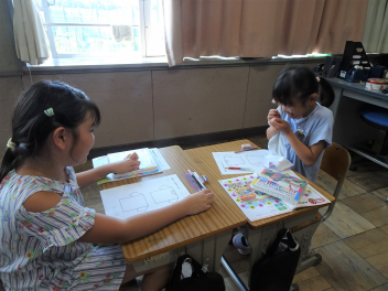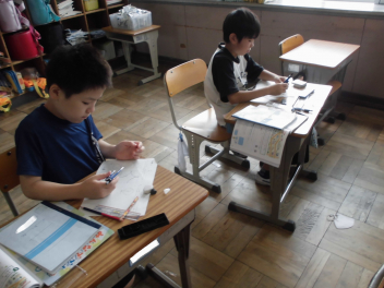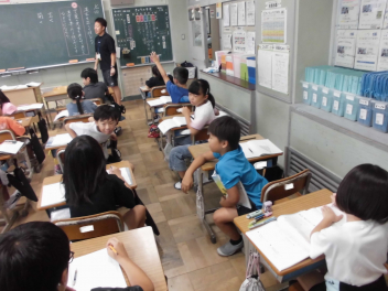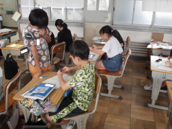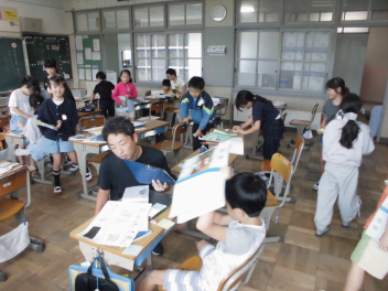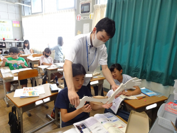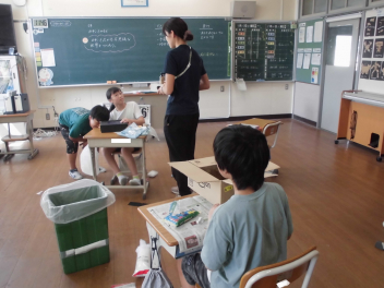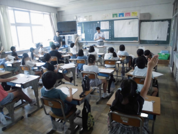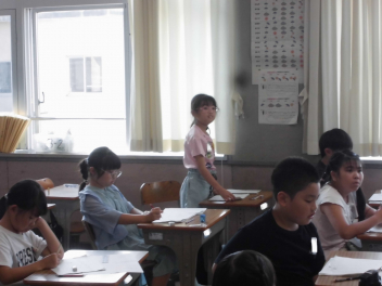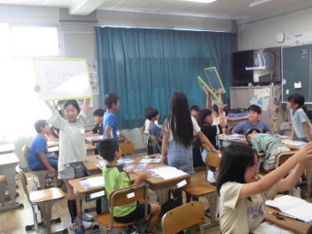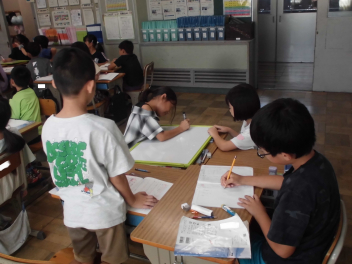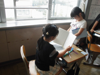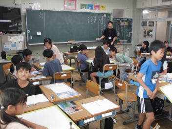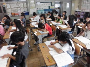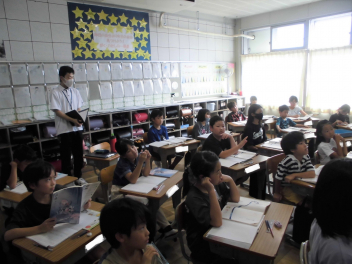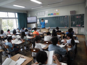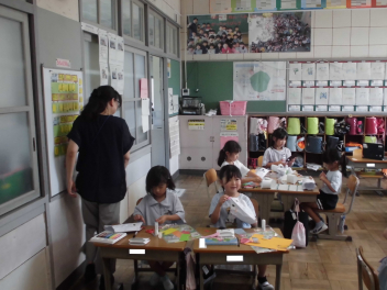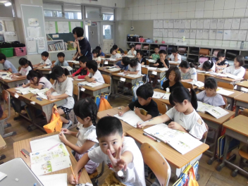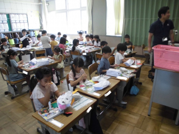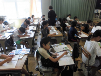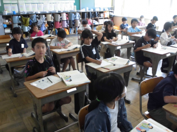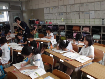 (↓) 3年3組;齋藤先生との授業です。各自の描いた「夏休みの思い出」を紹介し合っていました。みんなうれしそう
