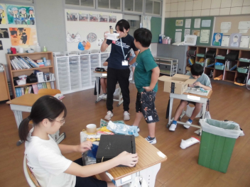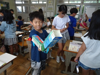 (↓) 若草4組;美希先生と図工「のぞいてみると」の授業です。箱や筒、色フィルムなどを組み合わせたり、そこに穴をあけたり…。創作物の中をのぞくと、いろいろな色が見えました