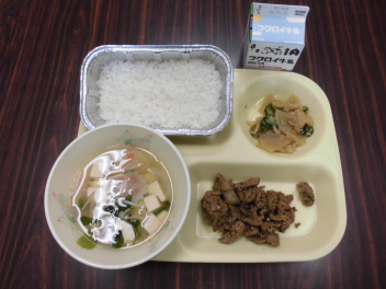 「御飯・牛乳・豚肉の浜納豆ソース炒め・大根のサラダ・すまし汁」が並びました。