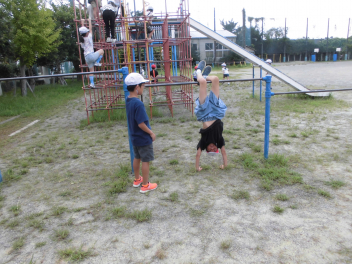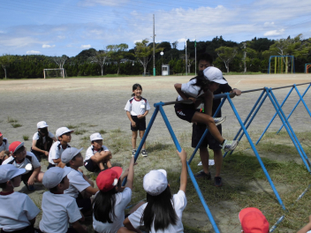 (↓) 4年3組;岡田先生と体育の授業でした。足かけ回りに挑戦している子がた~くさん