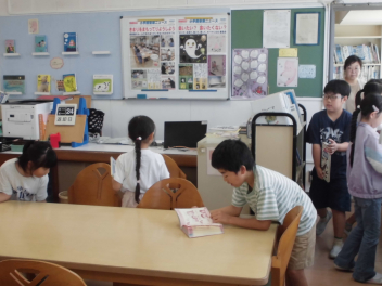 授業、委員会活動、シンフォニー練習等々、本当に忙しく動き回っている6年生が、貴重な休み時間を1年生と過ごしている姿です。手をつないで本を探していたり、お話を読んで聞かせてあげたり…。本当に優しい伊佐見っ子たちです