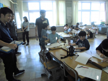 (↓) 若草学級;澤木先生、徳増先生と図工の授業です。様々な魚を描き、最後は釣り堀として楽しみました