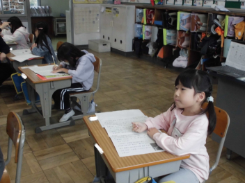 (↓) 1年2組;弥生先生と国語の授業。読み方を工夫して『くじらぐも』を音読していました