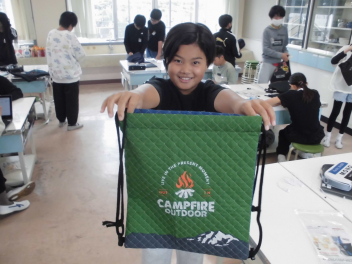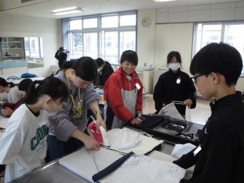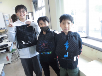 (↓) 6年3組;ボランティアの皆さんにも入っていただき、家庭科の授業に取り組みました。素敵なナップが完成!という子が何人もwink