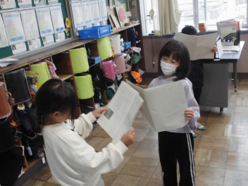 (↓) 3年3組;齋藤先生と社会科の授業です。先日の杏林堂見学の内容を新聞にまとめていました