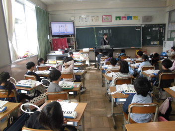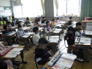 (↓) 1年1組;弥生先生との音楽授業 のぞいたタイミングでは、「日の丸の旗」を歌っていましたよ。