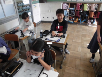 (↓) 3年1組;詩織先生と書写の授業。毛筆で「元」という字を書きました。最後の「はね」が難しいcool