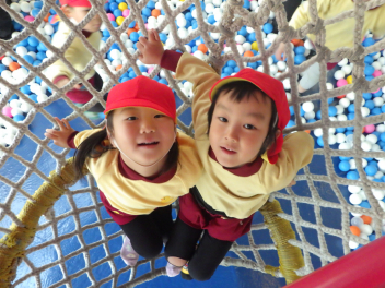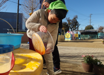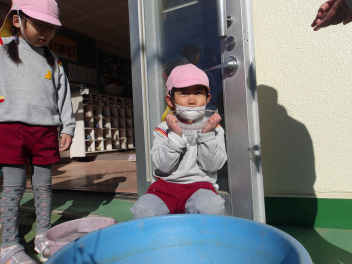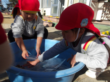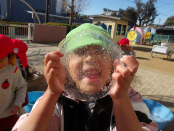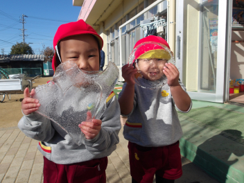 以前、年長組さんがバケツに水を張って置いておいたものがしっかりと凍っていました!