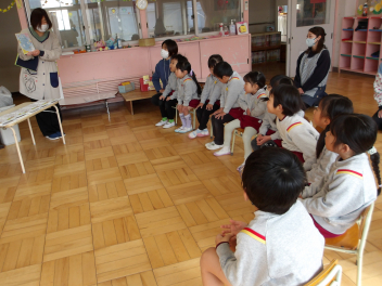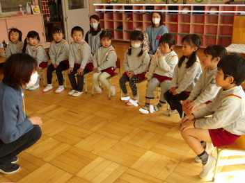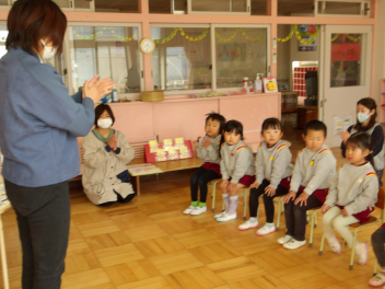 みんなで遊ぼうのコーナーでは、“いちごみるくゲーム”をしますという発表に大喜びの年長組さん。