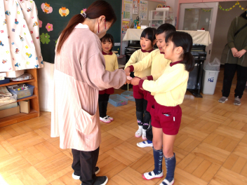 園長先生から、この1年、頑張ったことや大きくなったところを聞き、一人ずつ修了記念品をもらいました。