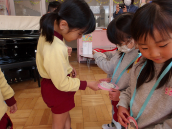 今まで、一緒に遊んでくれた年長組さんに感謝の気持ちを込めて、歌とメダルをプレゼントしました。