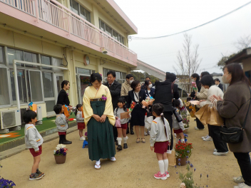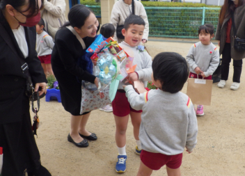年少組さんも式の後の花道で「卒園おめでとう!」「小学校へ行っても頑張ってね!」など、思い思いのメッセージを伝えていました