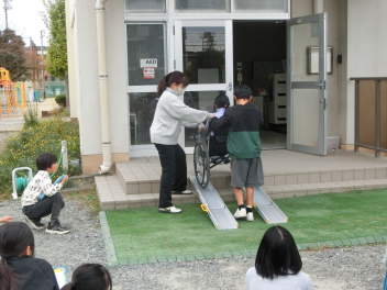 新村さんが、足の不自由な人が車いすで移動するときの介助の仕方を教えてくれました。