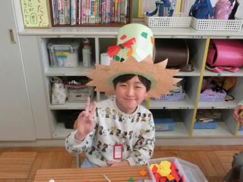 どんなデザインにしようかと、いろいろ考え、好きな色の折り紙を選んで、形を工夫しながら切ったり、折ったりして帽子に貼り付けました。