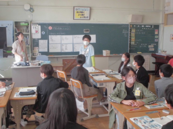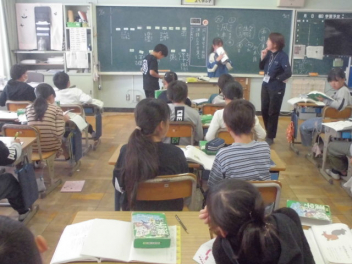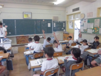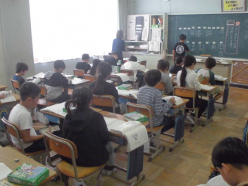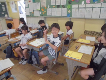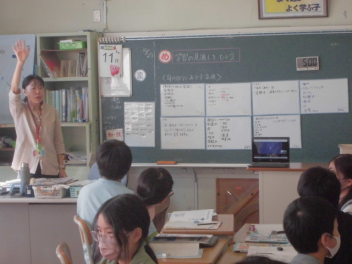 「水溶液の性質」の学習が始まります。今日の授業は、学習の見通しをもつことがねらいです。まずは、「水溶液」ってどんなものか考えました。「水道水は水溶液?」「ジュースはどうかな?」「油は?」「でも、『水と油のい関係』って言うよね。だから、そもそも違うものなんじゃない?」様々な意見が飛び交います。