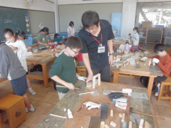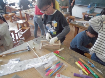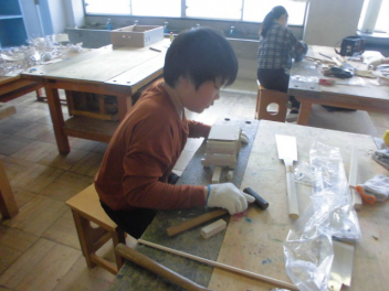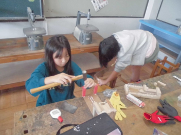 木材をのこぎりで切ったり、釘を打ち付けたりして、作品を制作しています。材料や用具を適切に扱い、手や体全体を十分に働かせて、切ってつないだり、組み合わせたりする経験をします。のこぎりなど、これまであまり使ったことのない用具を扱うと、世界が広がります!