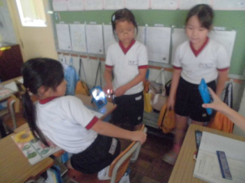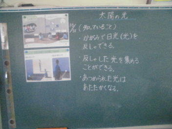太陽の光を鏡で反させたり、集めたりする学びを計画していたのですが、残念ながら今日は曇り空で太陽が出ていません。そこで、教室を暗くし、懐中電灯の光を太陽に見立ててのシミュレーションです。太陽が出たら、再度挑戦したいです!