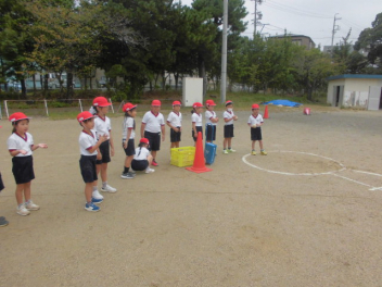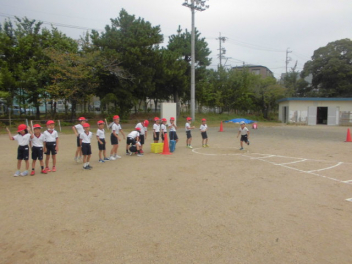 1年生が体力テストのボール投げに挑戦です。初めてなので、楽しみだけど少し緊張しています。「よし!投げるぞ!」と思ったら…雨が降り出したので、一時撤収です。「投げたかったな…。」
