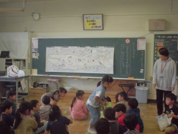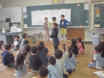 「くじらぐも」を音読します。場面の様子を思い浮かべながら音読することが、1年生の「読むこと」の学習で大切なことです。くじらぐもに乗っている感覚を味わえるように、少し高いところに乗って音読しています。