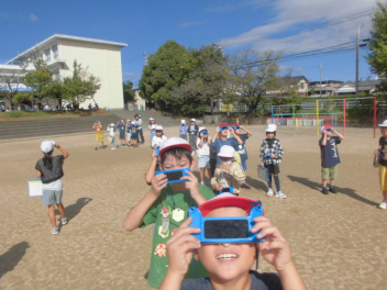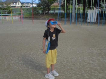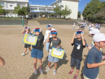 遮光版を使って太陽を観察しました。太陽を見て、驚きの声があがっていました。「太陽って丸い!」「月みたい!」