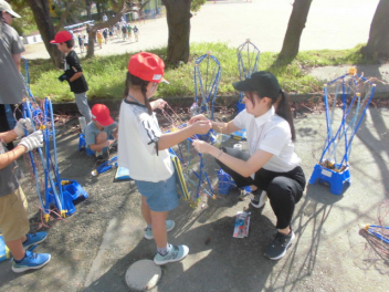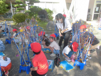 これまで育ててきたアサガオの「つる」を使って、リースを作りました。今年は気候の影響もあり、アサガオの花が長く咲いていました。もちろん、1年生の子供たちが水やりを欠かさなかったことが、大きい要因です。アサガオに、ありがとうの気持ちを込めながら鉢を崩し、残った「つる」で素敵なリースが完成しました。実は、支柱からつるをきれいに取ることが結構大変で、城北小サポーターの皆様にずいぶん助けていただきました。みんな、あきらめずに最後までやり遂げることができました。
