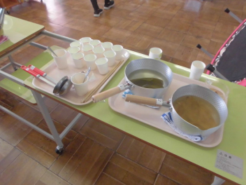 学校の栄養士さんから、「だし」について教えていただきました。「うまみ」という味覚があることを学び、「昆布だし」と「かつおだし」の違いを体験しました。