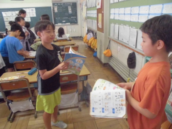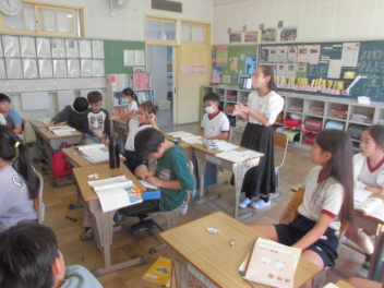 英語を使って、自分が好きなものを伝え合うコミュニケーション活動に取り組みました。ALTの先生にも聞いてもらいたいと、列ができていました。