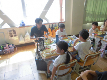 1年生も、グループで給食を食べています。仲良く会話をしながら、楽しそうに食べています。