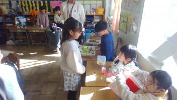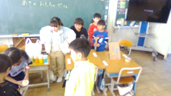 「秋のおもちゃランド」に幼稚園児のみなさんをご招待しました。手作りおもちゃで、楽しく遊んでもらうことができました。楽しんでもらえるように、説明の仕方や声掛けを工夫しました。
