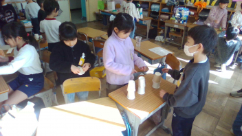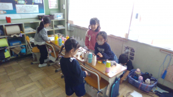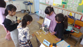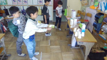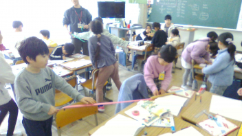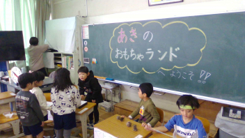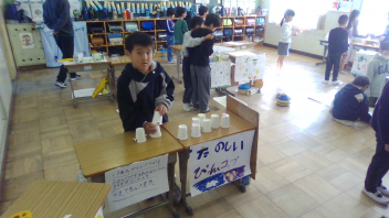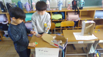 生活科で「うごくおもちゃ」を作りました。どのように動かすのかを、一人ひとりが考えて工夫し、一生懸命に作りました。今日は、お互いのおもちゃを紹介しながらみんなで楽しむ、「うごくおもちゃランド」の開催です。