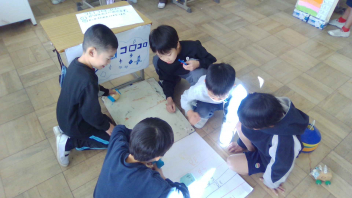 「長さ」の学習です。長いものを測るにはどうしたらよいか、みんなで考えました。両手を広げたいくつ分や紙テープを使って測るなどの考えが出され、実際に取り組んでみました。活動中にも、効率よく測るアイディアが次々と出てきて、「それいいね!」と意欲的に取り組んでいました。