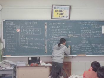 「6年生を送る会」の、学年の出し物について話し合っていました。司会を務める子、黒板書記を務める子など、役割分担をして進めていました。子供たちだけで主体的に話し合っている姿が、大変素晴らしかったです。司会者から、「“6年生を送る会”の目標に沿った出し物になるように考えよう。」という声もありました。う~ん、すばらしい!