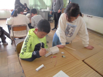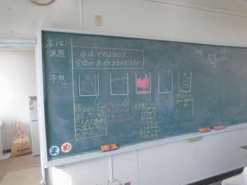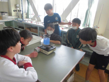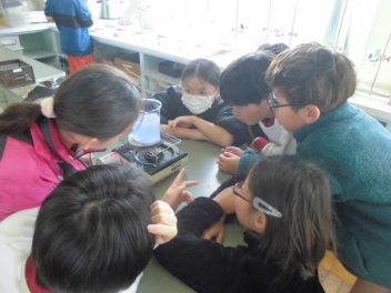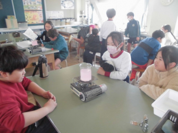 水の温まり方について、実験を通して理解しました。温まっていく水に色が付いているので、水の動きや流れを観察することができます。どの子も、じーっと水の動きを凝視しています。