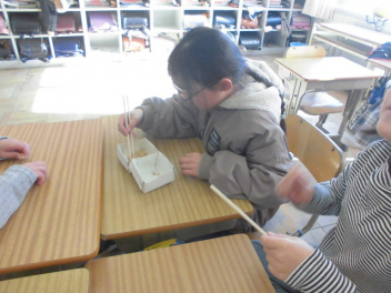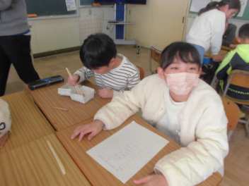 4年生が「豆つかみ」に挑戦していました。制限時間内に、割りばしで何個つかむことができるかを競っていました。けっこう上手な子が多くてびっくりしました。