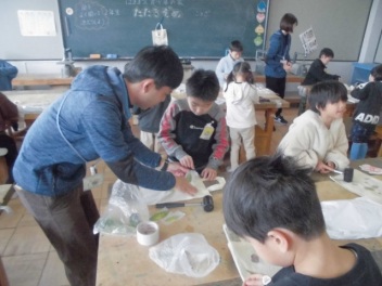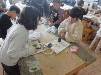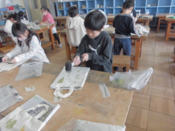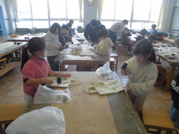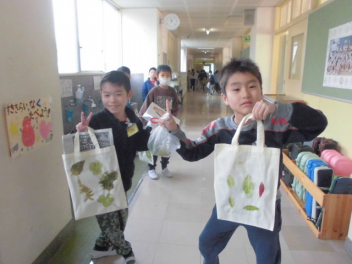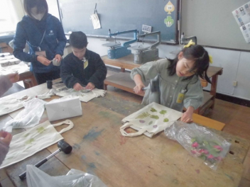 • 2年生が「たたき染め」に挑戦しました。葉っぱをハンマー等でたたくと、出てきた汁が染料となり、白い布にきれいな葉っぱの模様がうつります。「青少年の家」から職員さんが来てくださり、やり方を指導してくださいました。校庭等で拾った葉っぱを使って、思い思いの模様を描きました。素晴らしい作品がたくさんできました。