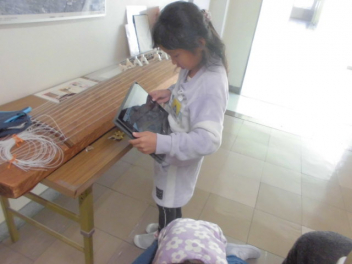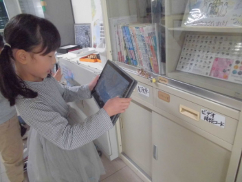 タブレット端末を使って図工の学習をしました。学校の中にある「すきま」を見つけ、そこに自分で作ったマスコットの「すきまちゃん」を置いて撮影します。「すきま」を見付けるのも、一人ひとりに個性やこだわりがあります。「すきまちゃん」の置き方や撮影の仕方などを工夫し、自分ならではの表現を考えました。