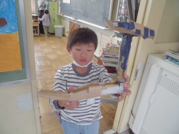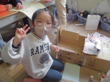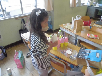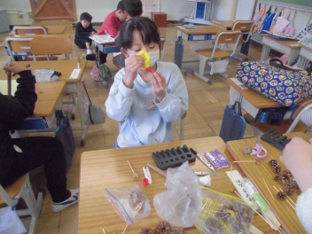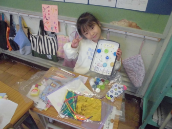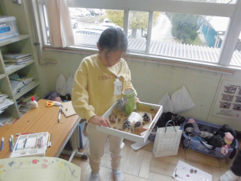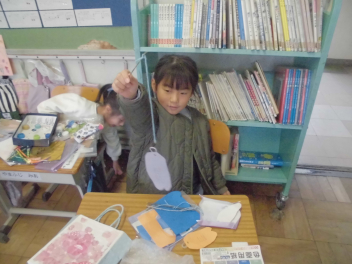 どんぐりや松ぼっくりなど、秋の材料も使いつつ、みんなで楽しく遊ぶことができるおもちゃを作っています。「校長先生、見て見て!」と、楽しそうな手作りおもちゃを紹介してくれました。