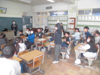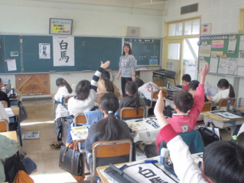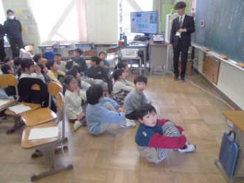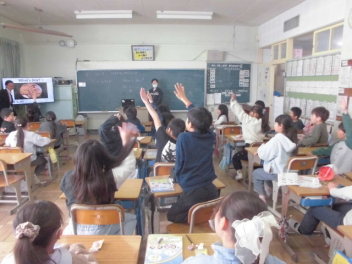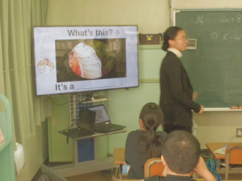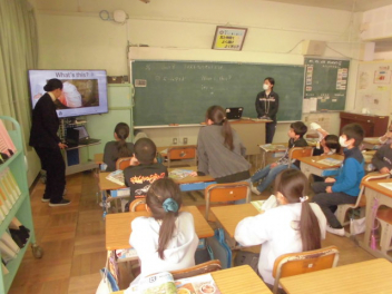 ALTの先生が、英語でクイズを出してくれています。子供たちは、勢いよく手を挙げて答えます。英語を上手につかって答えている姿に感心します。