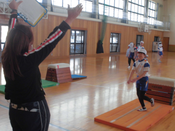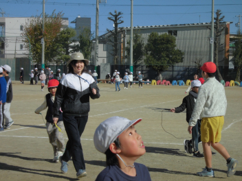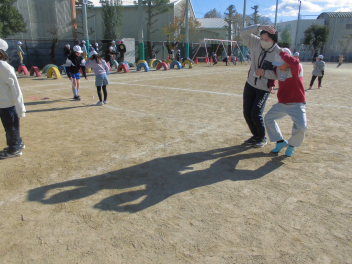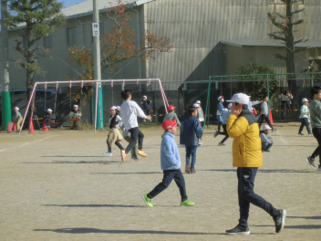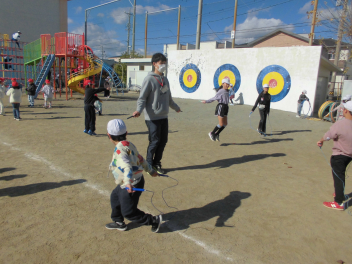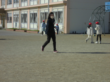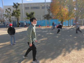 先生たちが、子供たちと一緒に走ったり縄跳びをしたりして過ごしていました