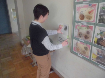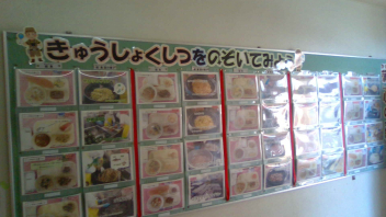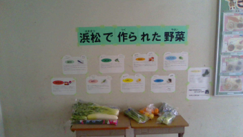 また、給食週間に合わせ、給食室の前には栄養職員の先生が地元・浜松で採れた新鮮な野菜を飾ってくれました。
