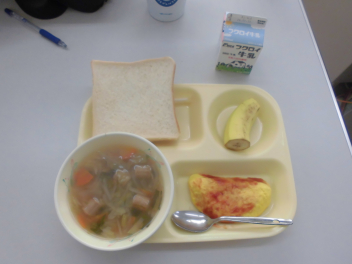 今日の献立も、エネルギー源になる主食、体を作る主菜(オムレツ)、体の調子を整える野菜スープやバナナと、栄養バランスがバッチリ組み合わされていました