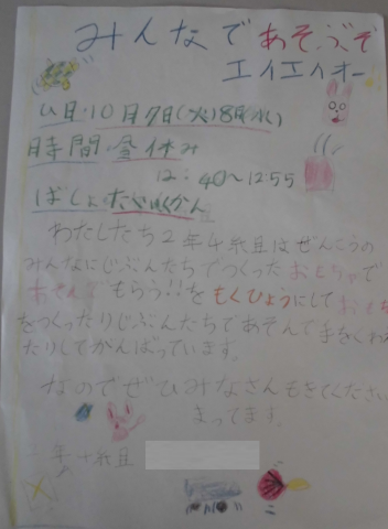 招待状やポスターをかいたり、放送で呼び掛けたりして、自分たちのイベントを創り上げていく姿が見られましたwink