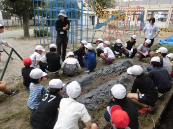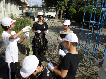 さつまいもを収穫する前日に、さつまいものつるを刈り取る作業をしました。