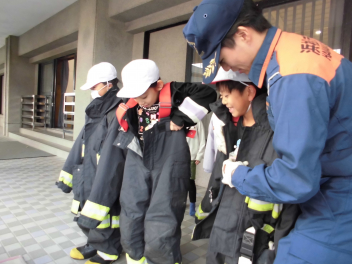 そのあと、実際の消防服や防火服を見せてもらい、着てみる体験もさせてもらいました。