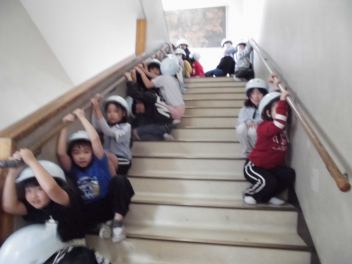 「お・は・し・も(おさない・はしらない・しゃべらない・もどらない)」を意識し、避難の途中で余震が起こる想定にも、落ち着いて座るなど、非常に真剣な表情で取り組んでいました。