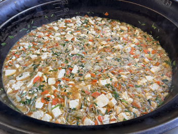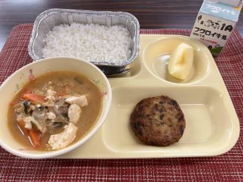 今日の「豆腐のチゲ」には、豚肉、豆腐、しょうが、にんにく、にんじん、白菜、もやし、えのき、にらを使用し、キムチや味噌などを合わせて煮込みました