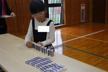 消しゴムを並べて、最後にドミノ倒しをします倒れた消しゴムの数が点数になります