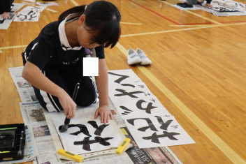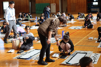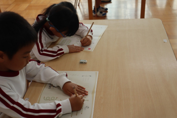 3年生は、まずは、必要な道具の置き方や墨のつけ方など、基本的なことを教えていただきましたsmileyそしていよいよ書き始めます最初、いつもの細い筆と違う大きな筆に、戸惑う姿も見られましたが、少しずつ筆に慣れていき、どんどん文字を書いていきました