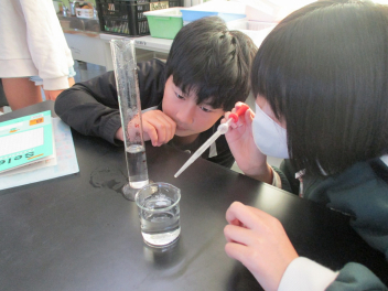 まずは50mlの水を正確にはかります。メスシリンダーとスポイトを上手に扱うことができました