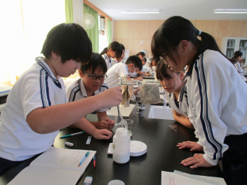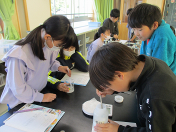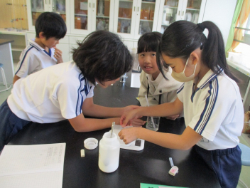 •  5年生の理科「もののとけ方」の授業の様子です。食塩が水にどれくらい溶けるのか、子供たちは実験方法を考え、意欲的に実験を行うことができました